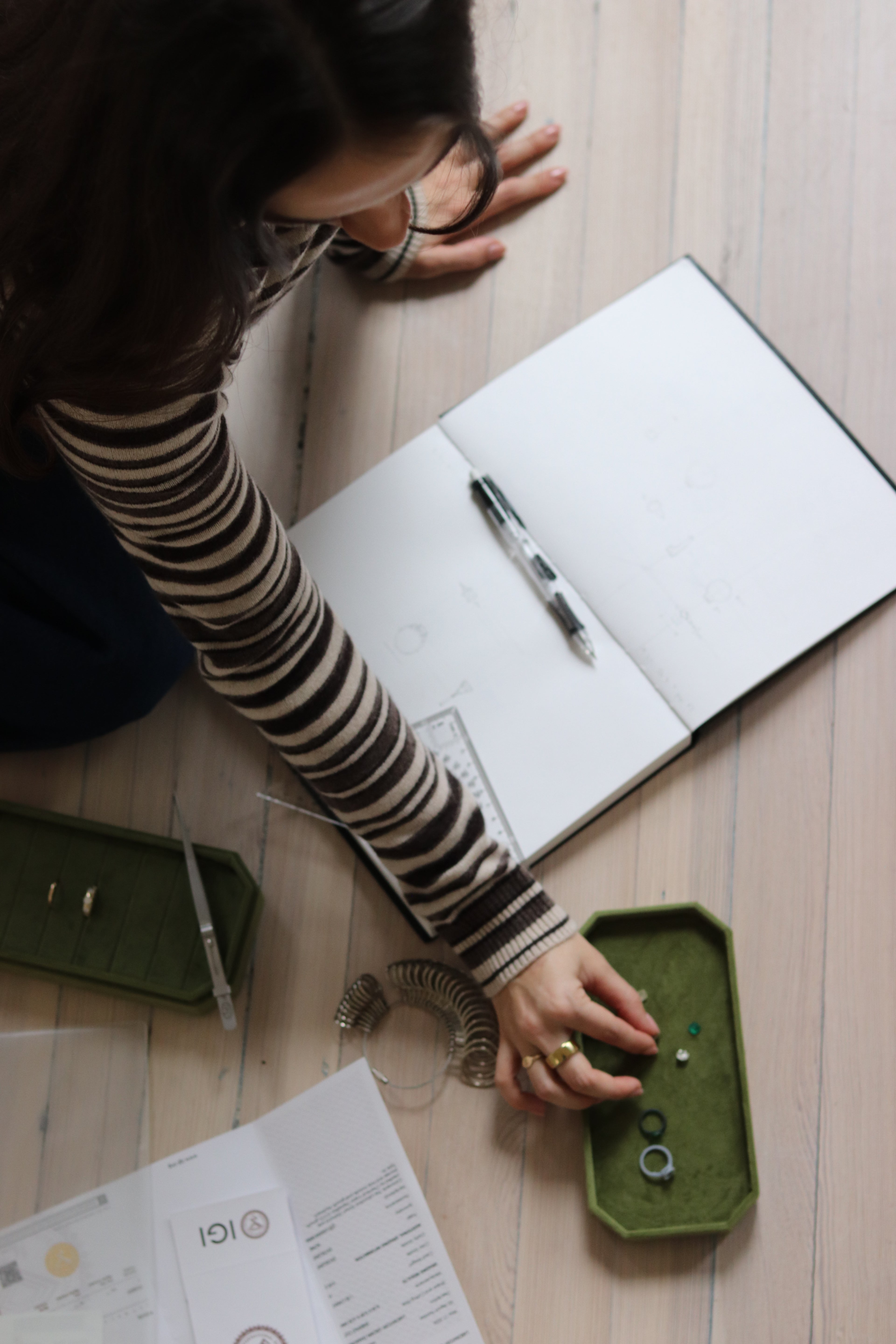 Using the final selected gemstone’s proportions and dimensions, Kiersten will bring the design details to life through a series of sketch options, refining elements of the setting, balance, and overall aesthetic.
